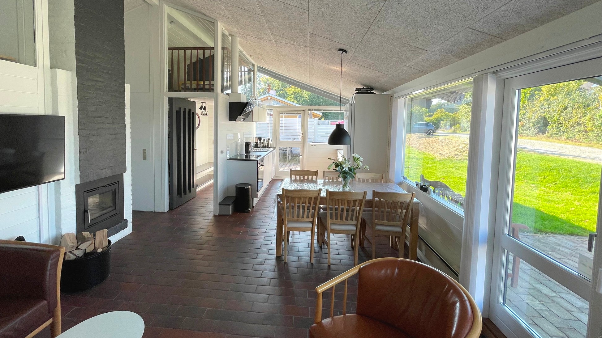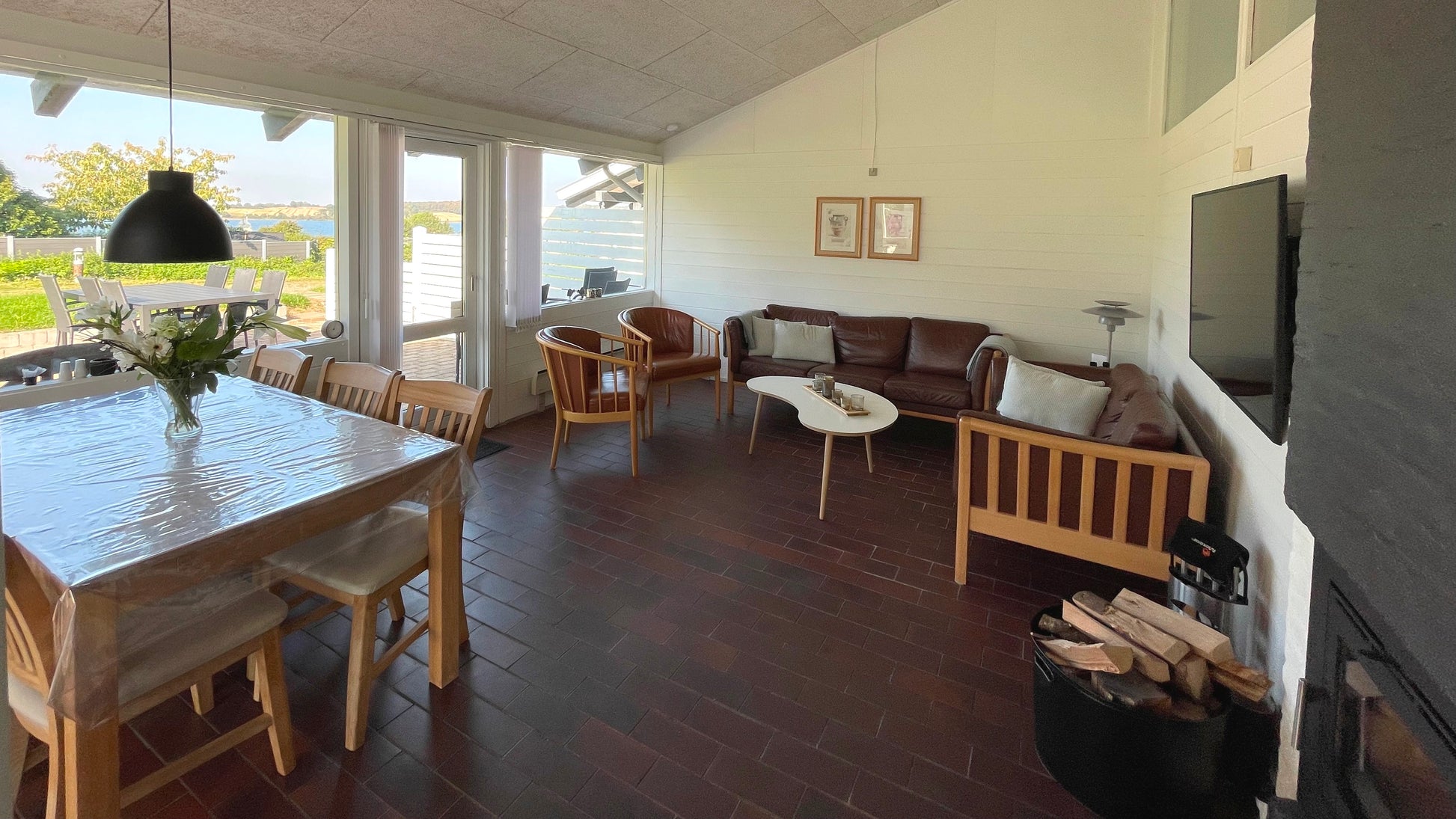 Panoramablick auf Genner Bugt vom Wohnzimmer, der Küche und der Terrasse
